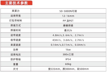 MT-001-N16 打包机头是铝合金外框,强度高,重量小,且美观大方;焊接接头超过20mm,结合强度可达85%以上;全电动驱动,稳定耐用,且总功率不超过1KW,节能降本;摩擦电机与送带张紧电机独立工作,可靠稳定;通过张紧机构可实现二次收紧;束紧力和送/收带速度均可调,适用更多产品不同捆扎要求